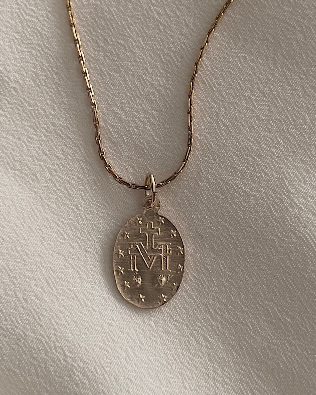 胸もとには優しくかがやくマリア様の小さなおメダイを。