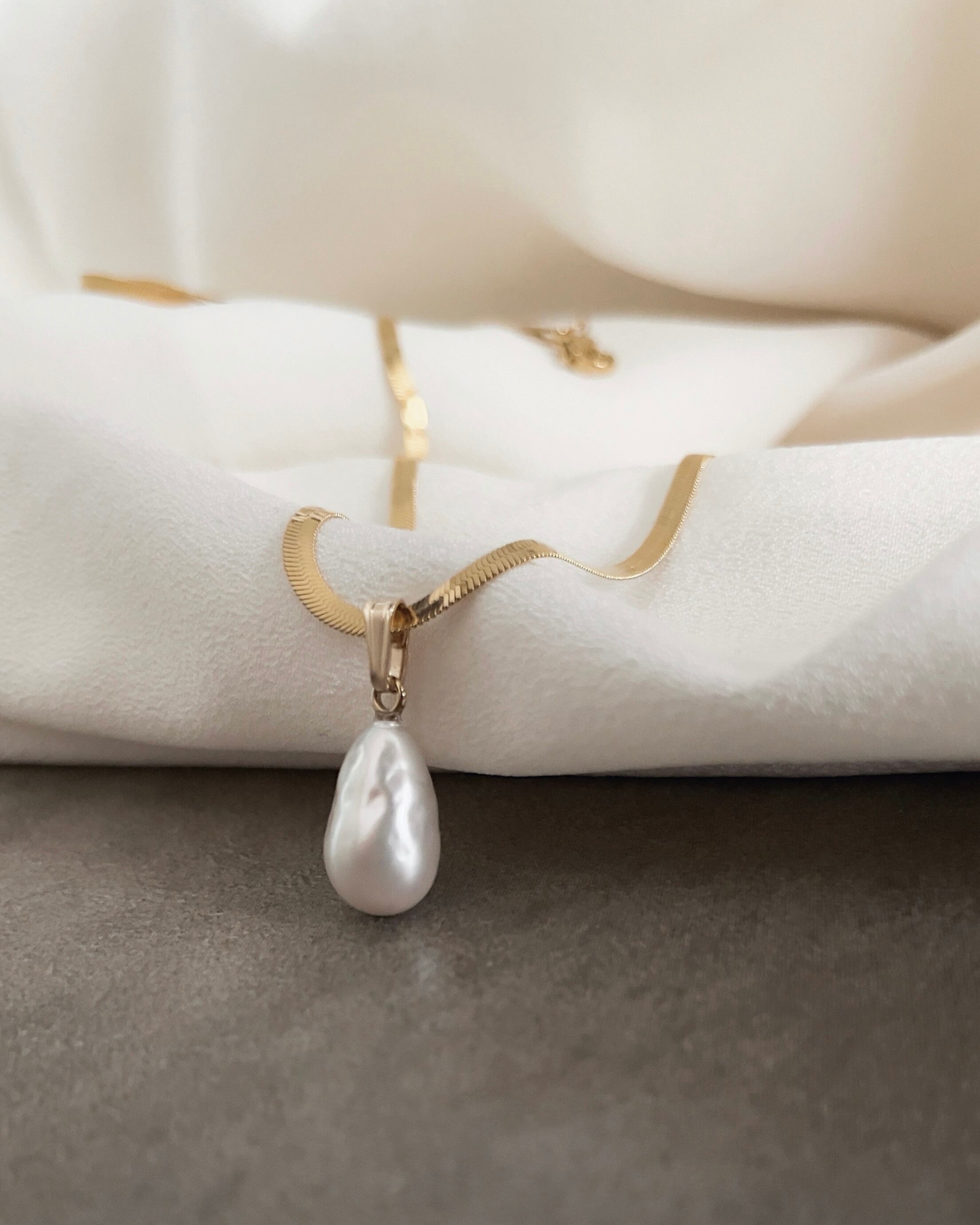 肌の上で柔らかな曲線を描くヘリンボーンチェーンと合わさることで、大人の胸元を明るく優雅に演出します。